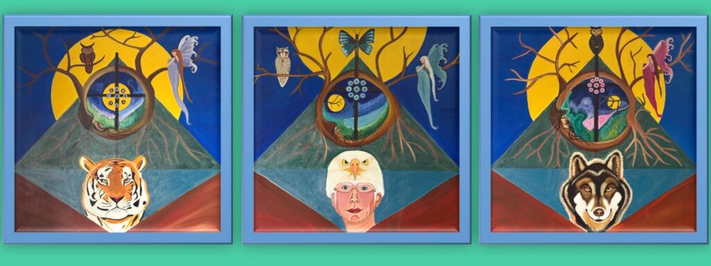 Below you’ll find a triptych. It consists of three self-made paintings, inspired by shamanism, specifically the underworld. Clicking on the triptych will bring up a slideshow of several paintings set to music.